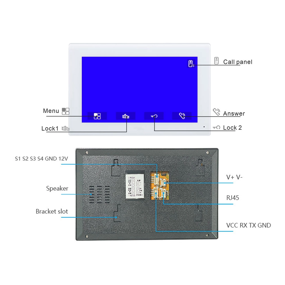 - O alimentare simplă și inteligentă: Nu te mai încurci în cabluri! Sistemul nostru poate alimenta atât soneria, cât și încuietoarea electronică de la ușă, direct de la monitor.